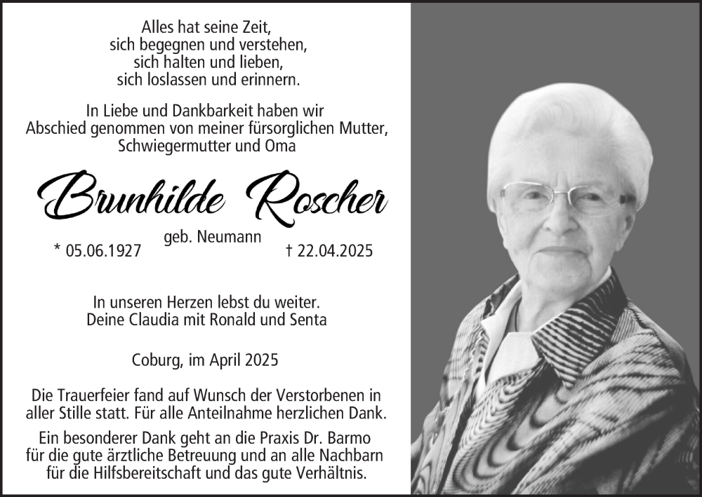 Hier finden Sie alle Traueranzeigen aus der Zeitung, die bisher für Burnhilde Roscher erschienen sind. Weitere Traueranzeigen, die in der Zeitung erscheinen, werden hier ebenfalls aufgelistet