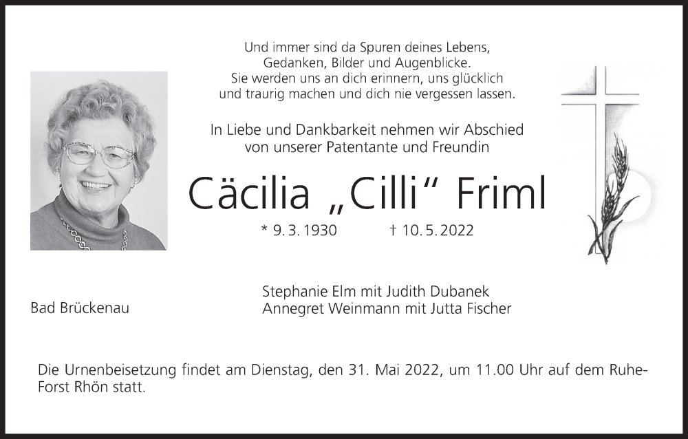 Hier finden Sie alle Traueranzeigen aus der Zeitung, die bisher für Cäcilia Friml erschienen sind. Weitere Traueranzeigen, die in der Zeitung erscheinen, werden hier ebenfalls aufgelistet
