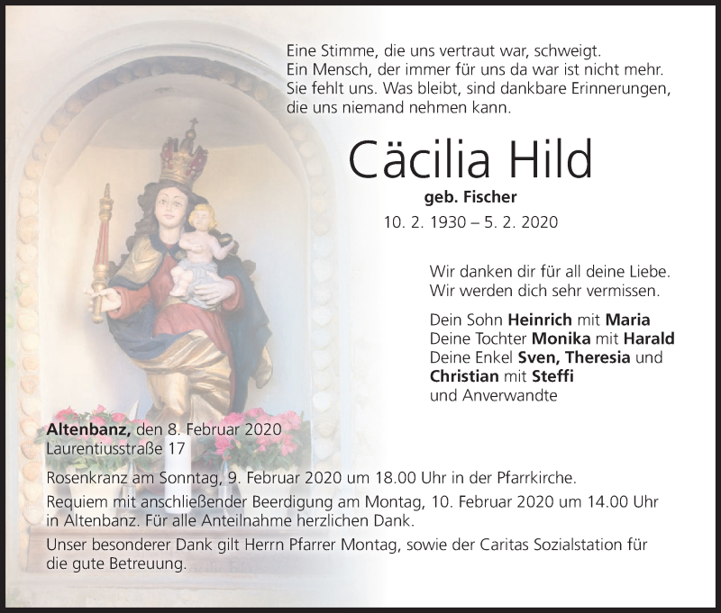 Hier finden Sie alle Traueranzeigen aus der Zeitung, die bisher für Cäcilia Hild erschienen sind. Weitere Traueranzeigen, die in der Zeitung erscheinen, werden hier ebenfalls aufgelistet