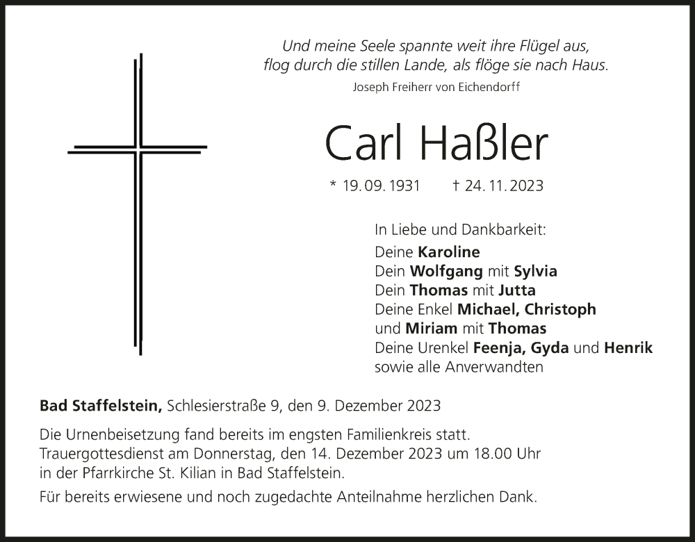 Hier finden Sie alle Traueranzeigen aus der Zeitung, die bisher für Carl Haßler erschienen sind. Weitere Traueranzeigen, die in der Zeitung erscheinen, werden hier ebenfalls aufgelistet