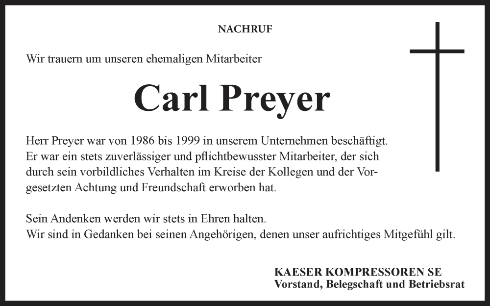 Hier finden Sie alle Traueranzeigen aus der Zeitung, die bisher für Carl Preyer erschienen sind. Weitere Traueranzeigen, die in der Zeitung erscheinen, werden hier ebenfalls aufgelistet