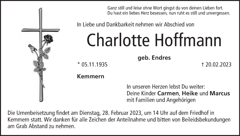 Hier finden Sie alle Traueranzeigen aus der Zeitung, die bisher für Charlotte Hoffmann erschienen sind. Weitere Traueranzeigen, die in der Zeitung erscheinen, werden hier ebenfalls aufgelistet