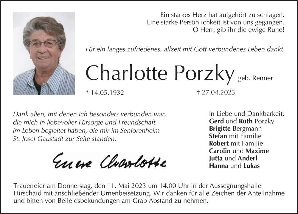 Hier finden Sie alle Traueranzeigen aus der Zeitung, die bisher für Charlotte Porzky erschienen sind. Weitere Traueranzeigen, die in der Zeitung erscheinen, werden hier ebenfalls aufgelistet