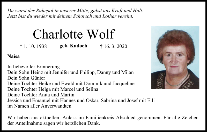 Hier finden Sie alle Traueranzeigen aus der Zeitung, die bisher für Charlotte Wolf erschienen sind. Weitere Traueranzeigen, die in der Zeitung erscheinen, werden hier ebenfalls aufgelistet