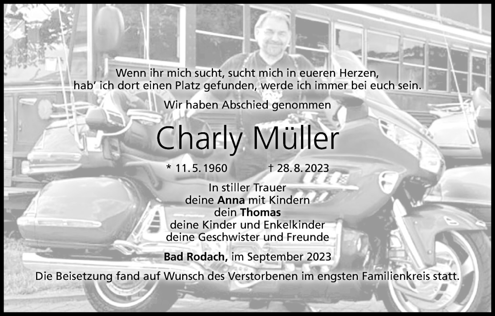 Hier finden Sie alle Traueranzeigen aus der Zeitung, die bisher für Charly Müller erschienen sind. Weitere Traueranzeigen, die in der Zeitung erscheinen, werden hier ebenfalls aufgelistet