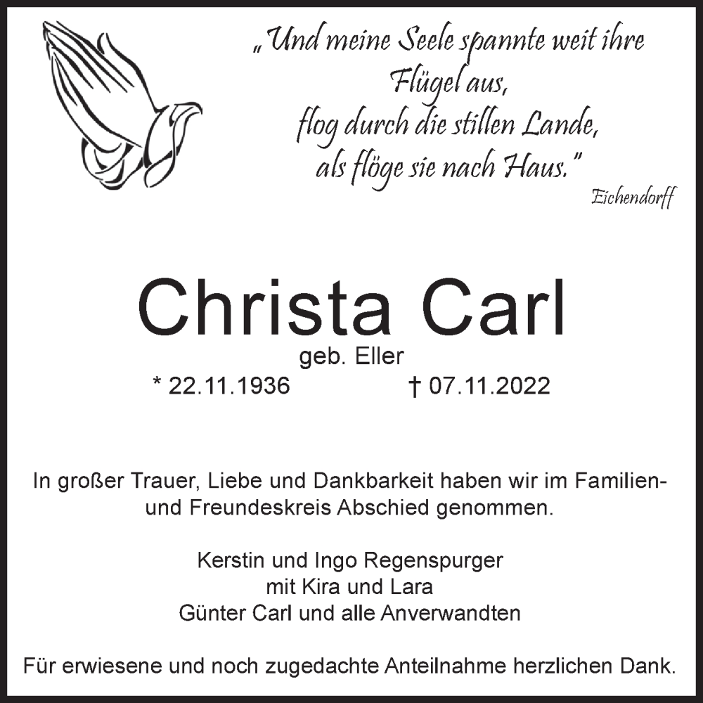 Hier finden Sie alle Traueranzeigen aus der Zeitung, die bisher für Christa Carl erschienen sind. Weitere Traueranzeigen, die in der Zeitung erscheinen, werden hier ebenfalls aufgelistet
