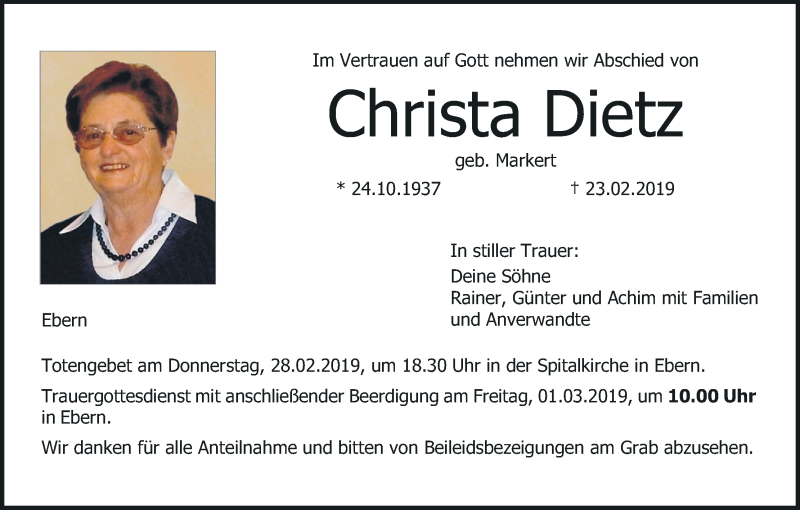 Hier finden Sie alle Traueranzeigen aus der Zeitung, die bisher für Christa Dietz erschienen sind. Weitere Traueranzeigen, die in der Zeitung erscheinen, werden hier ebenfalls aufgelistet