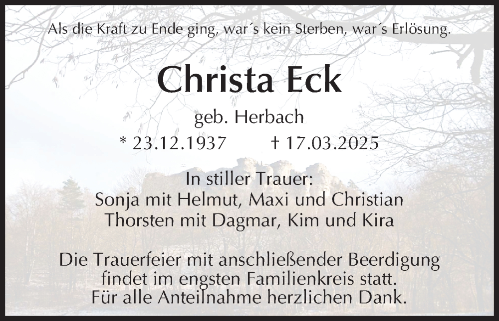 Hier finden Sie alle Traueranzeigen aus der Zeitung, die bisher für Christa Eck erschienen sind. Weitere Traueranzeigen, die in der Zeitung erscheinen, werden hier ebenfalls aufgelistet