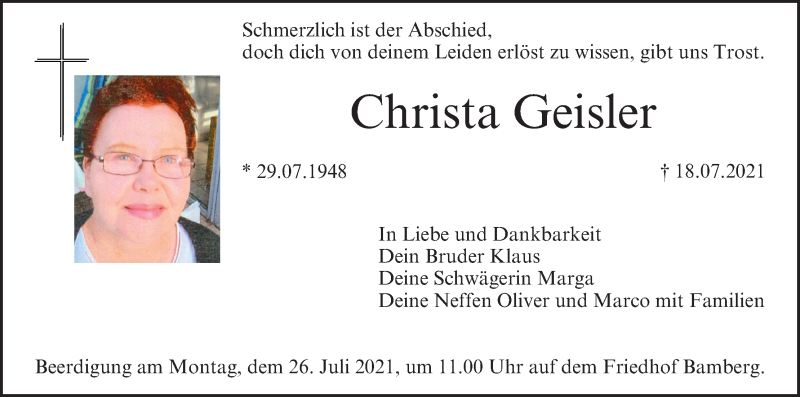 Hier finden Sie alle Traueranzeigen aus der Zeitung, die bisher für Christa Geisler erschienen sind. Weitere Traueranzeigen, die in der Zeitung erscheinen, werden hier ebenfalls aufgelistet