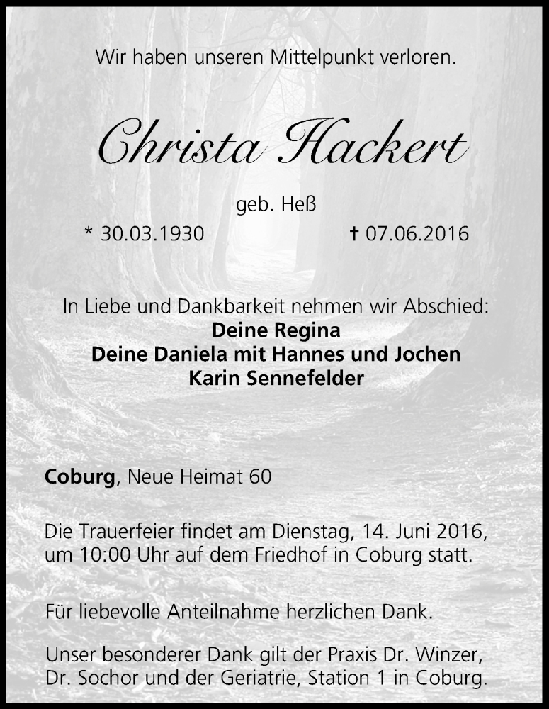 Hier finden Sie alle Traueranzeigen aus der Zeitung, die bisher für Christa Hackert erschienen sind. Weitere Traueranzeigen, die in der Zeitung erscheinen, werden hier ebenfalls aufgelistet