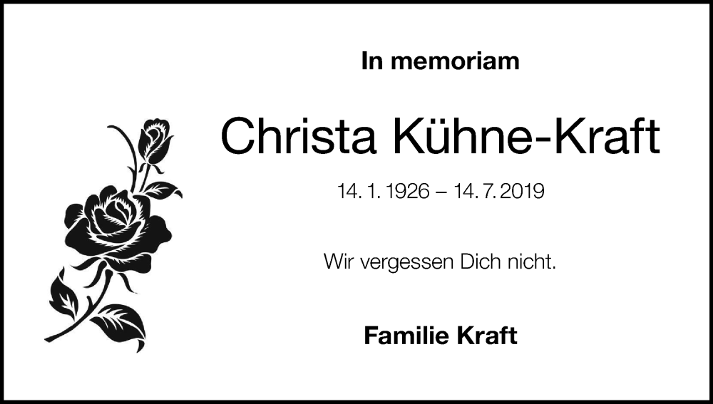 Hier finden Sie alle Traueranzeigen aus der Zeitung, die bisher für Christa Kühne-Kraft erschienen sind. Weitere Traueranzeigen, die in der Zeitung erscheinen, werden hier ebenfalls aufgelistet