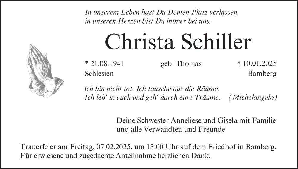 Hier finden Sie alle Traueranzeigen aus der Zeitung, die bisher für Christa Schiller erschienen sind. Weitere Traueranzeigen, die in der Zeitung erscheinen, werden hier ebenfalls aufgelistet
