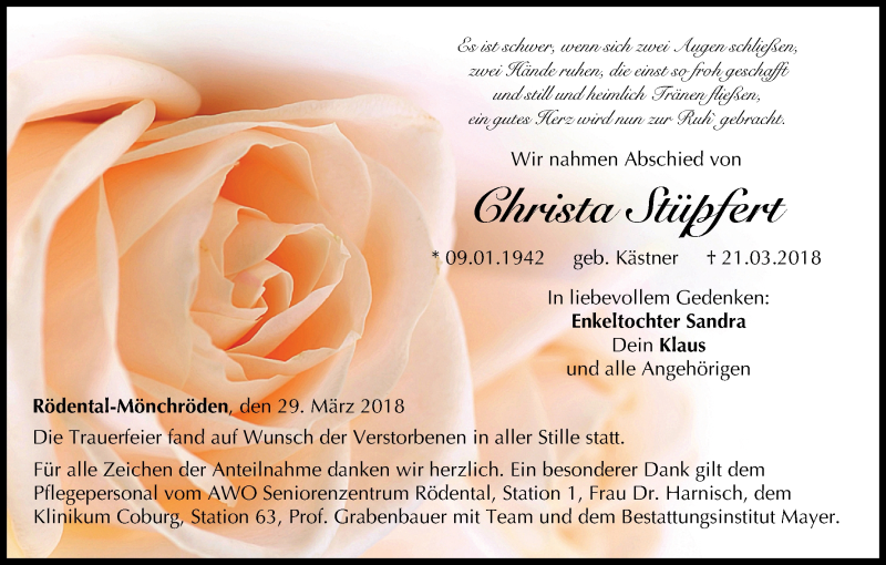 Hier finden Sie alle Traueranzeigen aus der Zeitung, die bisher für Christa Stüpfert erschienen sind. Weitere Traueranzeigen, die in der Zeitung erscheinen, werden hier ebenfalls aufgelistet