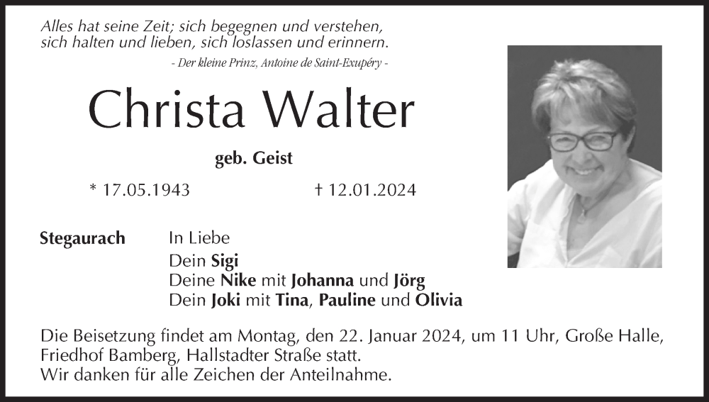 Hier finden Sie alle Traueranzeigen aus der Zeitung, die bisher für Christa Walter erschienen sind. Weitere Traueranzeigen, die in der Zeitung erscheinen, werden hier ebenfalls aufgelistet
