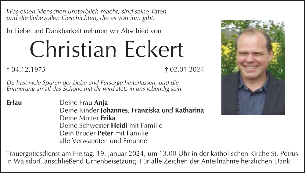 Hier finden Sie alle Traueranzeigen aus der Zeitung, die bisher für Christian Eckert erschienen sind. Weitere Traueranzeigen, die in der Zeitung erscheinen, werden hier ebenfalls aufgelistet