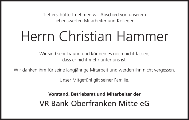 Hier finden Sie alle Traueranzeigen aus der Zeitung, die bisher für Christian Hammer erschienen sind. Weitere Traueranzeigen, die in der Zeitung erscheinen, werden hier ebenfalls aufgelistet