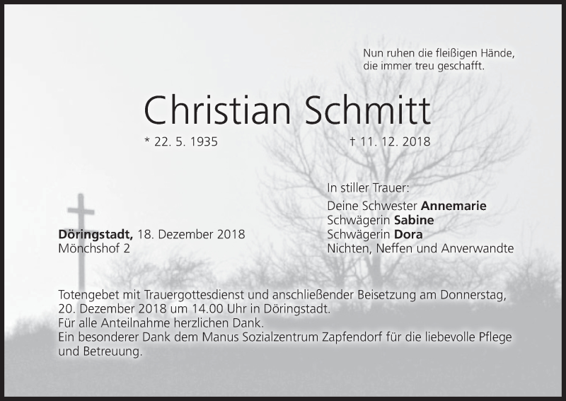 Hier finden Sie alle Traueranzeigen aus der Zeitung, die bisher für Christian Schmitt erschienen sind. Weitere Traueranzeigen, die in der Zeitung erscheinen, werden hier ebenfalls aufgelistet