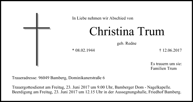 Hier finden Sie alle Traueranzeigen aus der Zeitung, die bisher für Christina Trum erschienen sind. Weitere Traueranzeigen, die in der Zeitung erscheinen, werden hier ebenfalls aufgelistet