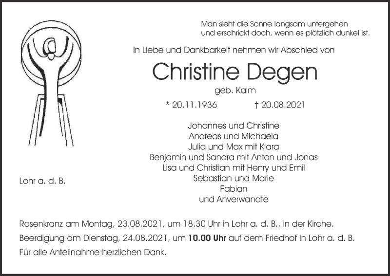 Hier finden Sie alle Traueranzeigen aus der Zeitung, die bisher für Christine Degen erschienen sind. Weitere Traueranzeigen, die in der Zeitung erscheinen, werden hier ebenfalls aufgelistet
