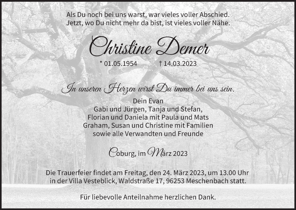 Hier finden Sie alle Traueranzeigen aus der Zeitung, die bisher für Christine Demer erschienen sind. Weitere Traueranzeigen, die in der Zeitung erscheinen, werden hier ebenfalls aufgelistet