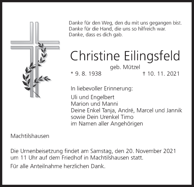 Hier finden Sie alle Traueranzeigen aus der Zeitung, die bisher für Christine Eilingsfeld erschienen sind. Weitere Traueranzeigen, die in der Zeitung erscheinen, werden hier ebenfalls aufgelistet