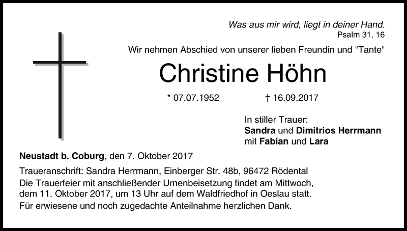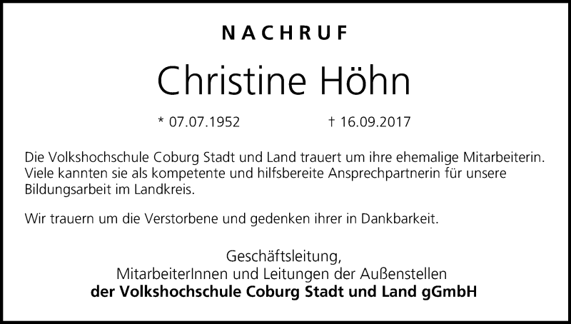 Hier finden Sie alle Traueranzeigen aus der Zeitung, die bisher für Christine Höhn erschienen sind. Weitere Traueranzeigen, die in der Zeitung erscheinen, werden hier ebenfalls aufgelistet
