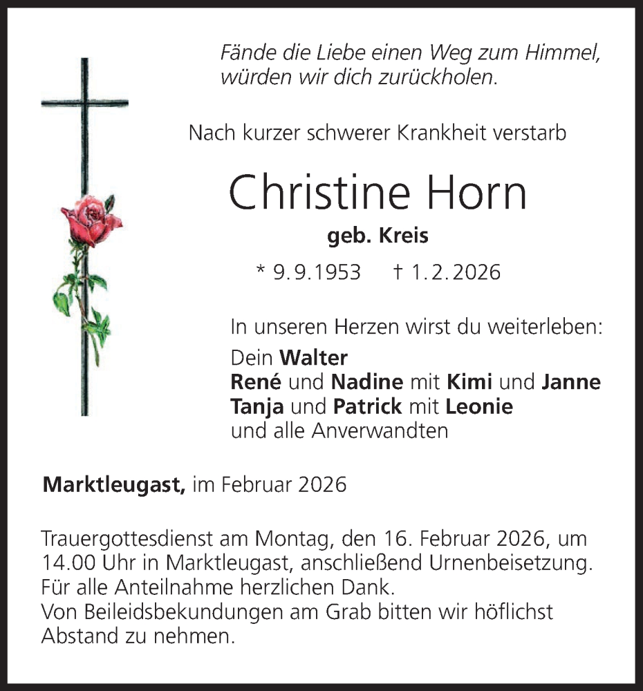 Hier finden Sie alle Traueranzeigen aus der Zeitung, die bisher für Christine Horn erschienen sind. Weitere Traueranzeigen, die in der Zeitung erscheinen, werden hier ebenfalls aufgelistet