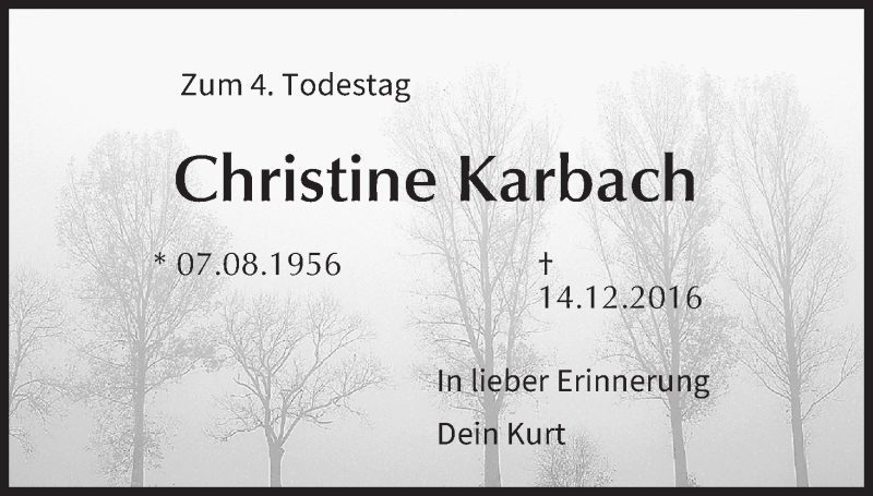 Hier finden Sie alle Traueranzeigen aus der Zeitung, die bisher für Christine Karbach erschienen sind. Weitere Traueranzeigen, die in der Zeitung erscheinen, werden hier ebenfalls aufgelistet