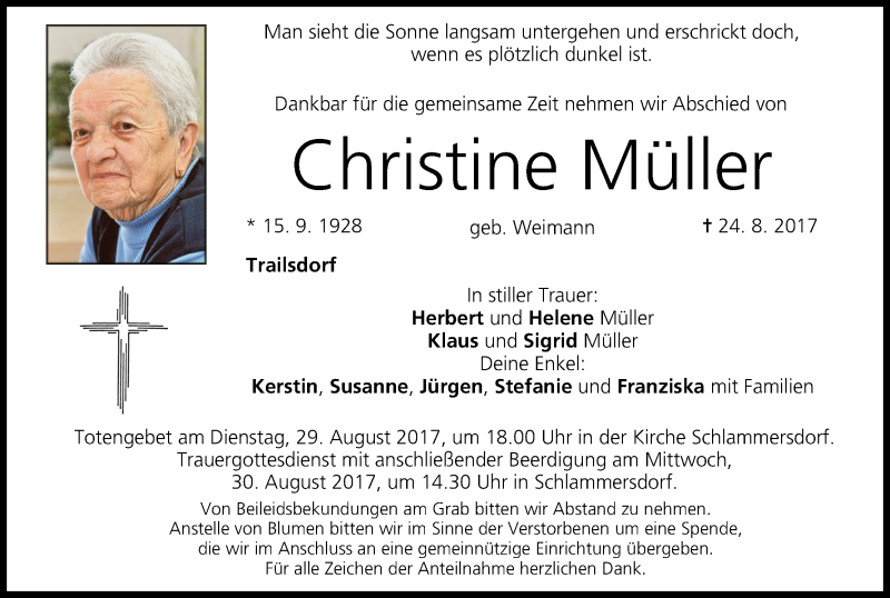 Hier finden Sie alle Traueranzeigen aus der Zeitung, die bisher für Christine Müller erschienen sind. Weitere Traueranzeigen, die in der Zeitung erscheinen, werden hier ebenfalls aufgelistet