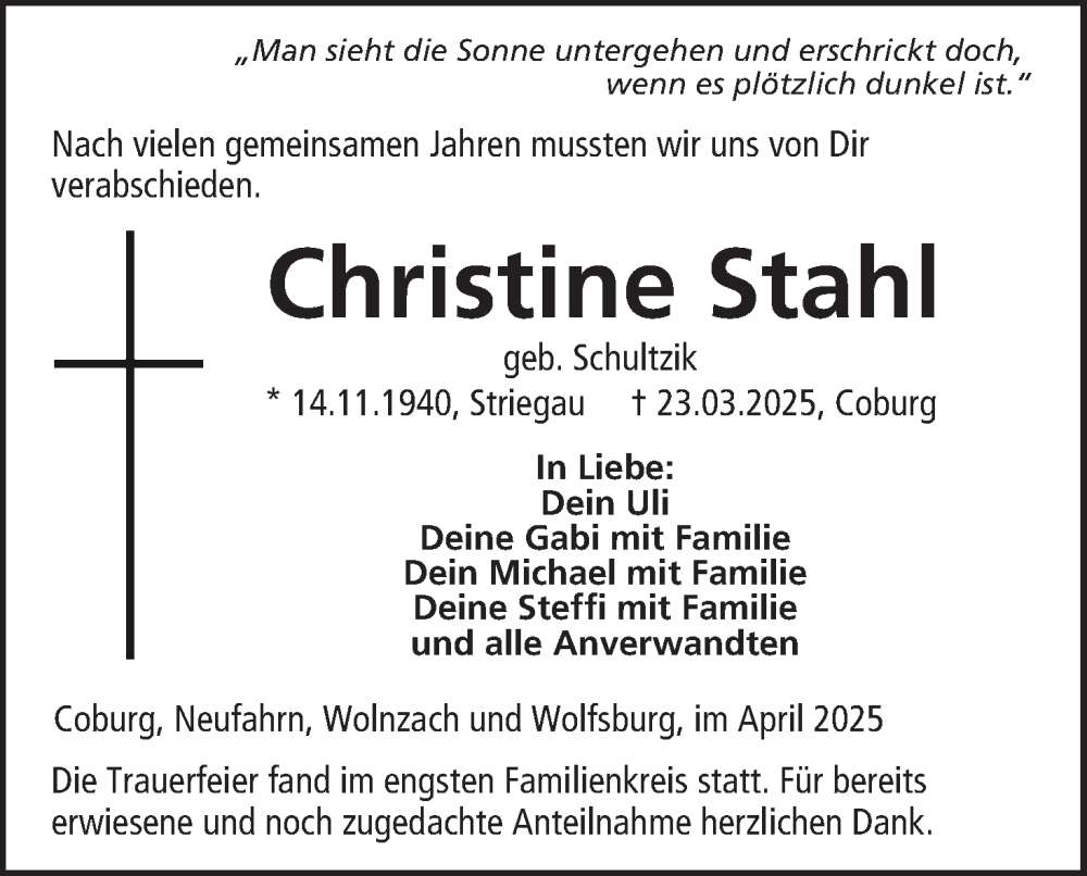 Hier finden Sie alle Traueranzeigen aus der Zeitung, die bisher für Christine Stahl erschienen sind. Weitere Traueranzeigen, die in der Zeitung erscheinen, werden hier ebenfalls aufgelistet