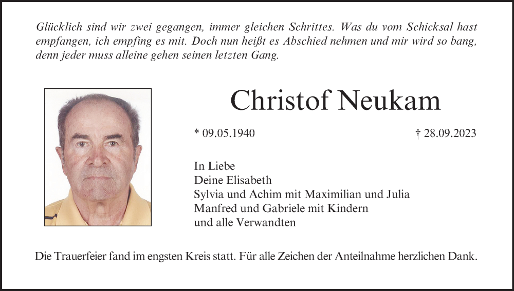 Hier finden Sie alle Traueranzeigen aus der Zeitung, die bisher für Christof Neukam erschienen sind. Weitere Traueranzeigen, die in der Zeitung erscheinen, werden hier ebenfalls aufgelistet