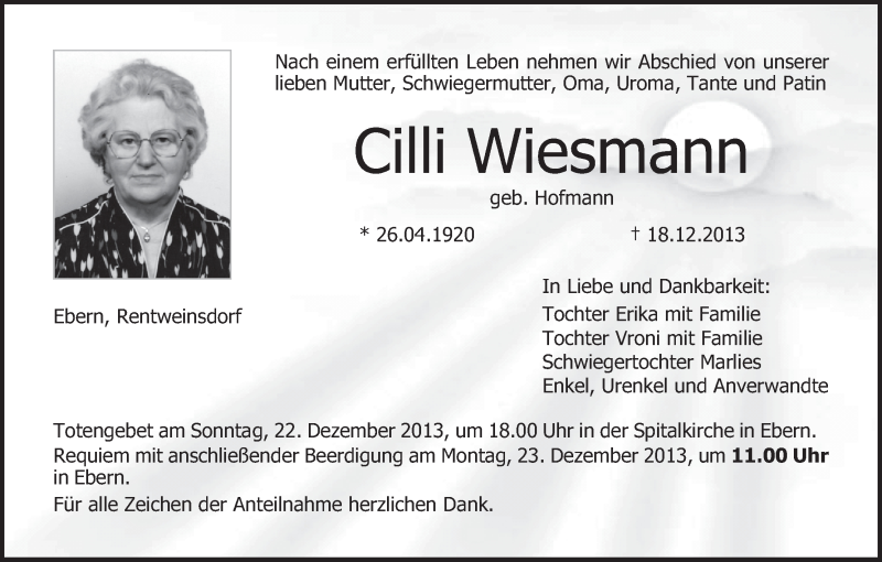 Hier finden Sie alle Traueranzeigen aus der Zeitung, die bisher für Cilli Wiesmann erschienen sind. Weitere Traueranzeigen, die in der Zeitung erscheinen, werden hier ebenfalls aufgelistet