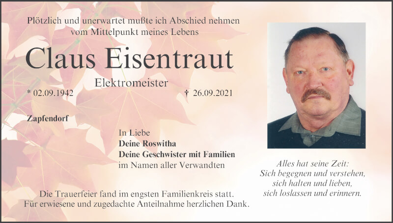Hier finden Sie alle Traueranzeigen aus der Zeitung, die bisher für Claus Eisentraut erschienen sind. Weitere Traueranzeigen, die in der Zeitung erscheinen, werden hier ebenfalls aufgelistet