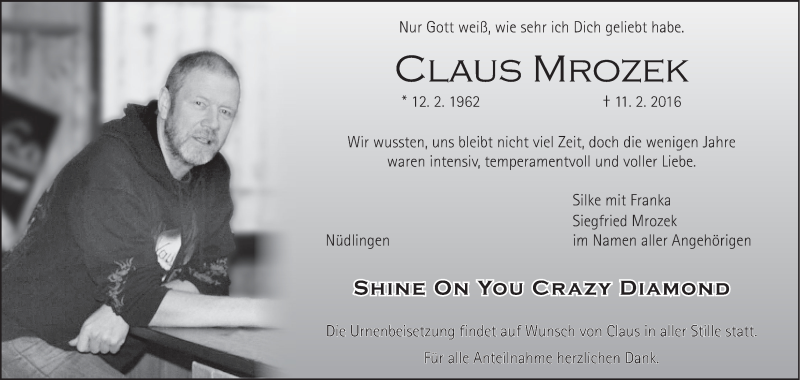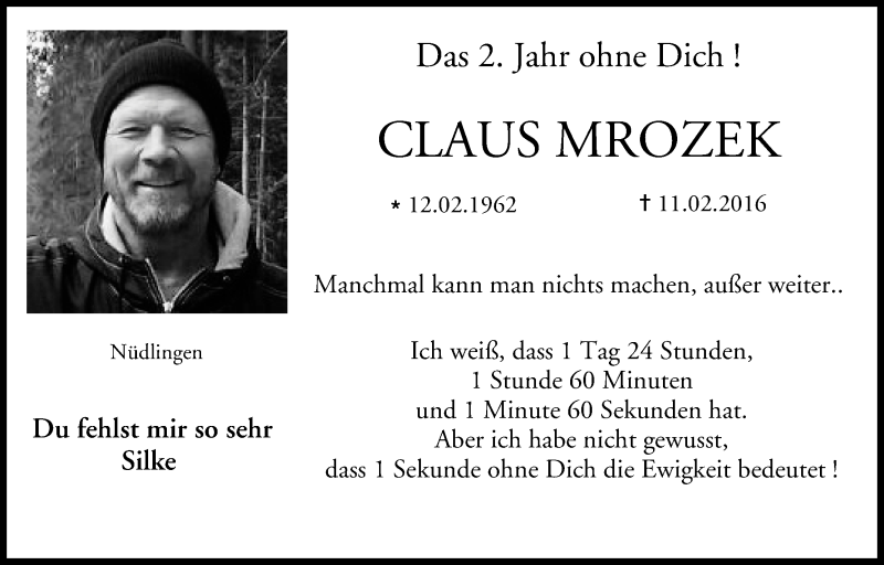 Hier finden Sie alle Traueranzeigen aus der Zeitung, die bisher für Claus Mrozek erschienen sind. Weitere Traueranzeigen, die in der Zeitung erscheinen, werden hier ebenfalls aufgelistet