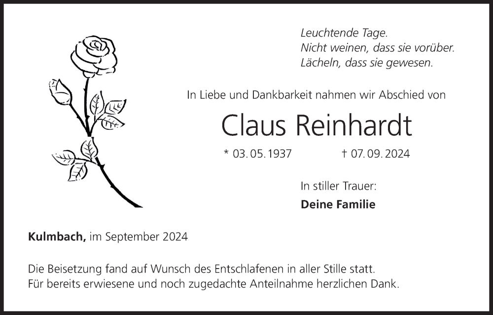 Hier finden Sie alle Traueranzeigen aus der Zeitung, die bisher für Claus Reinhardt erschienen sind. Weitere Traueranzeigen, die in der Zeitung erscheinen, werden hier ebenfalls aufgelistet