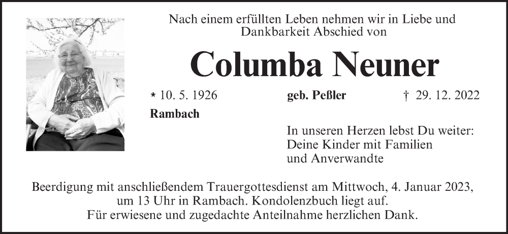 Hier finden Sie alle Traueranzeigen aus der Zeitung, die bisher für Columba Neuner erschienen sind. Weitere Traueranzeigen, die in der Zeitung erscheinen, werden hier ebenfalls aufgelistet