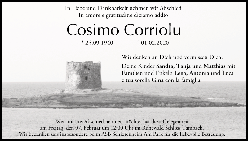 Hier finden Sie alle Traueranzeigen aus der Zeitung, die bisher für Cosimo Corriolu erschienen sind. Weitere Traueranzeigen, die in der Zeitung erscheinen, werden hier ebenfalls aufgelistet