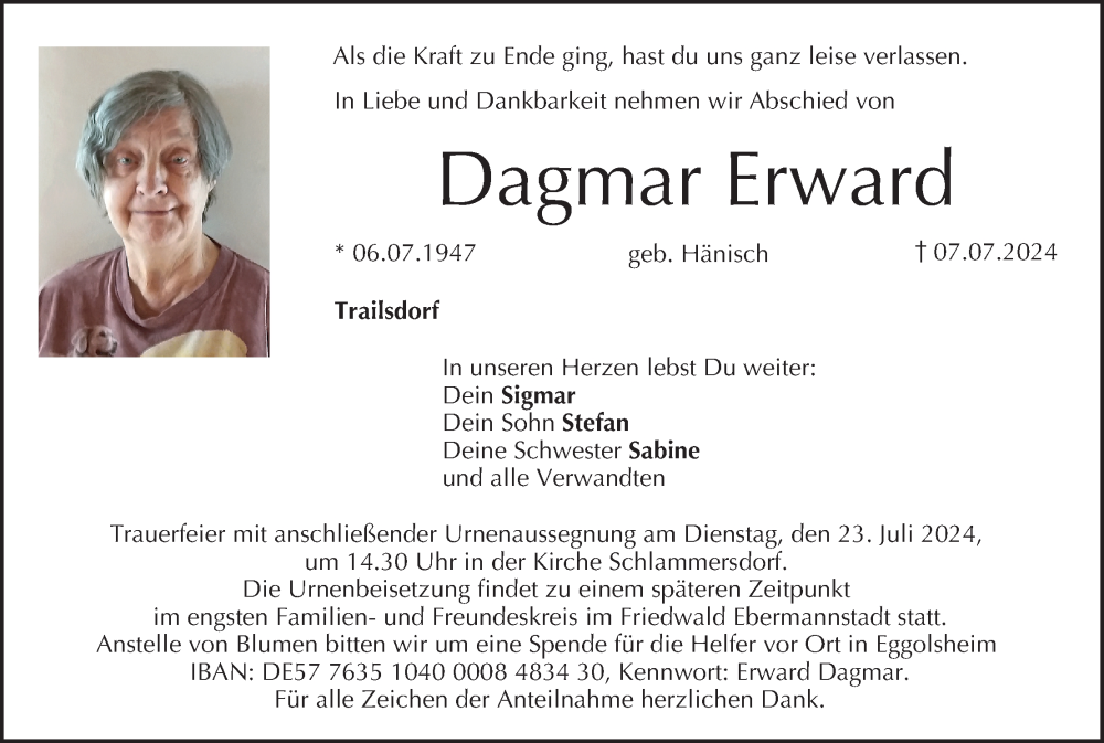 Hier finden Sie alle Traueranzeigen aus der Zeitung, die bisher für Dagmar Erward erschienen sind. Weitere Traueranzeigen, die in der Zeitung erscheinen, werden hier ebenfalls aufgelistet