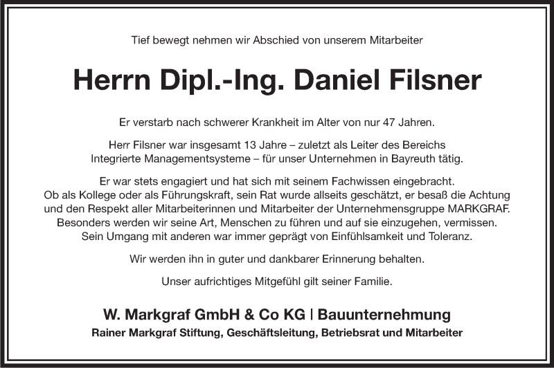 Hier finden Sie alle Traueranzeigen aus der Zeitung, die bisher für Daniel Filsner erschienen sind. Weitere Traueranzeigen, die in der Zeitung erscheinen, werden hier ebenfalls aufgelistet