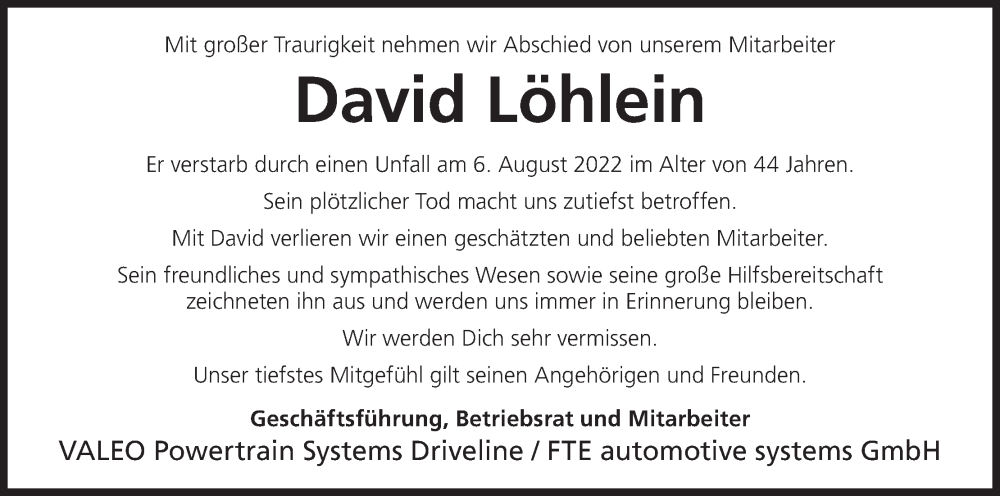Hier finden Sie alle Traueranzeigen aus der Zeitung, die bisher für David Löhlein erschienen sind. Weitere Traueranzeigen, die in der Zeitung erscheinen, werden hier ebenfalls aufgelistet