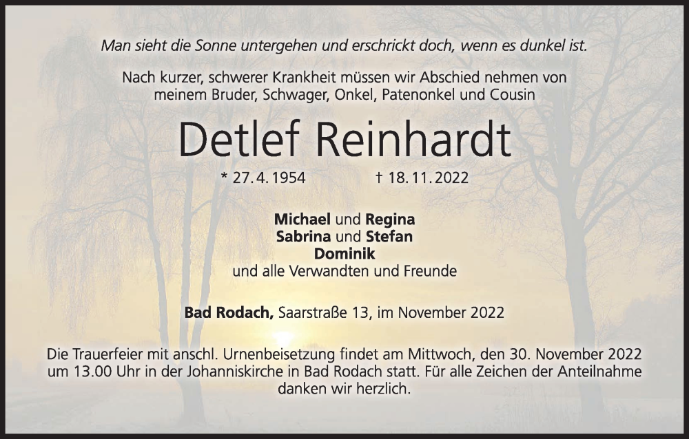 Hier finden Sie alle Traueranzeigen aus der Zeitung, die bisher für Detlef Reinhardt erschienen sind. Weitere Traueranzeigen, die in der Zeitung erscheinen, werden hier ebenfalls aufgelistet