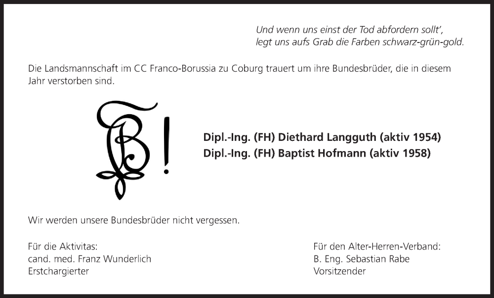 Hier finden Sie alle Traueranzeigen aus der Zeitung, die bisher für Die Landsmannschaft im CC Franco-Borussia zu Coburg trauert um ihre Bundesbrüder, die in diesem Jahr verstorben sind. erschienen sind. Weitere Traueranzeigen, die in der Zeitung erscheinen, werden hier ebenfalls aufgelistet