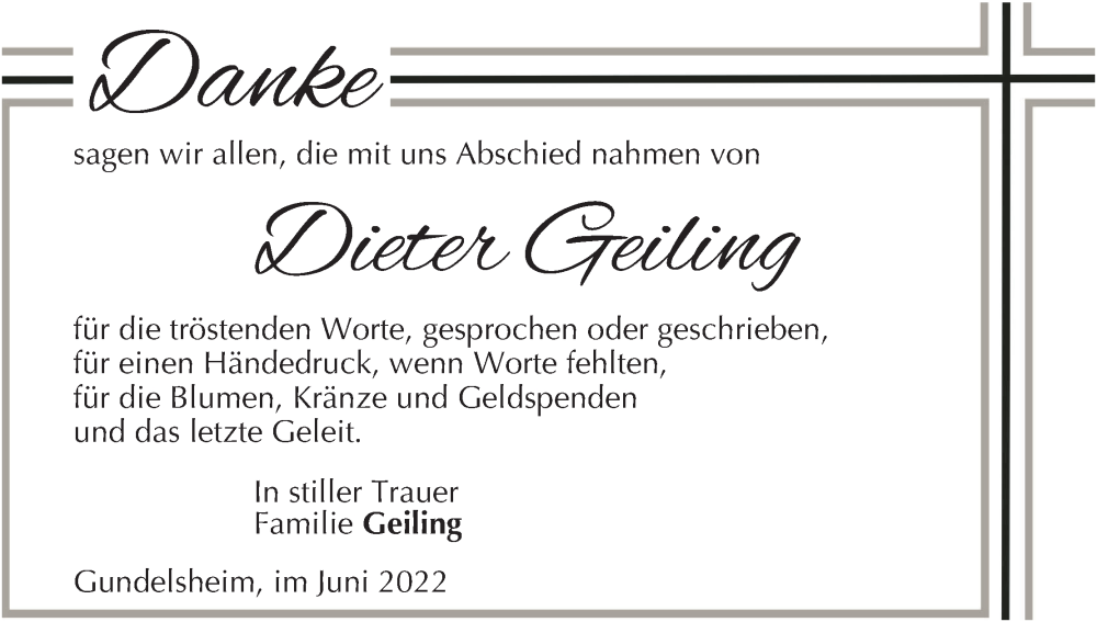 Hier finden Sie alle Traueranzeigen aus der Zeitung, die bisher für Dieter Geiling erschienen sind. Weitere Traueranzeigen, die in der Zeitung erscheinen, werden hier ebenfalls aufgelistet
