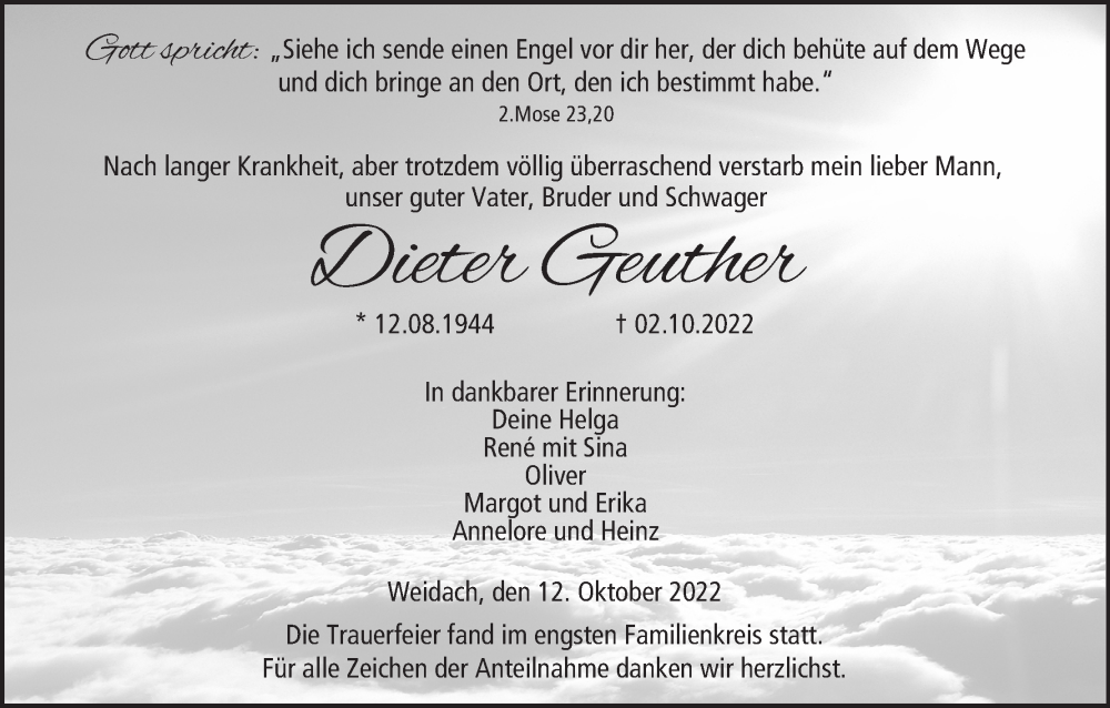 Hier finden Sie alle Traueranzeigen aus der Zeitung, die bisher für Dieter Geuther erschienen sind. Weitere Traueranzeigen, die in der Zeitung erscheinen, werden hier ebenfalls aufgelistet