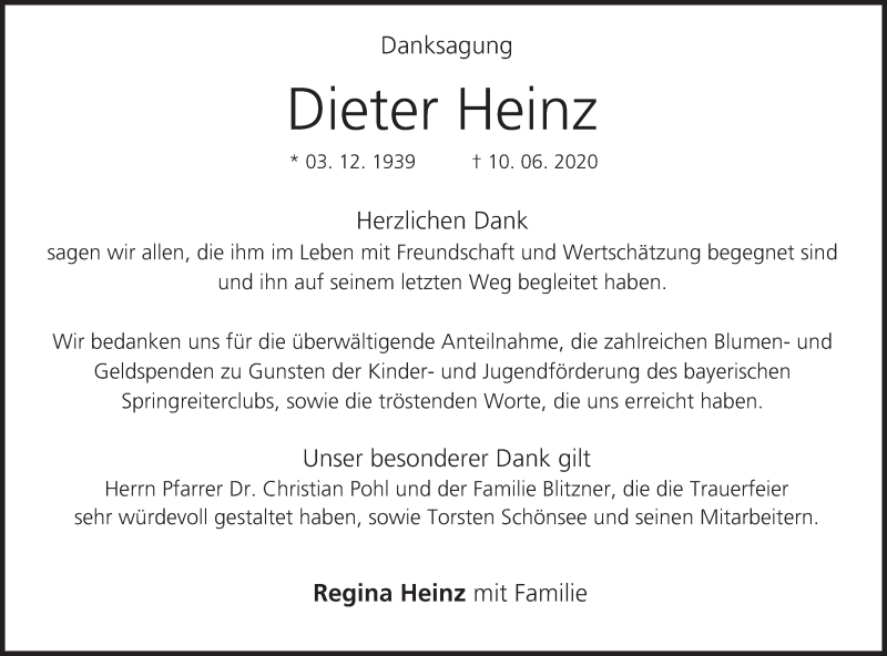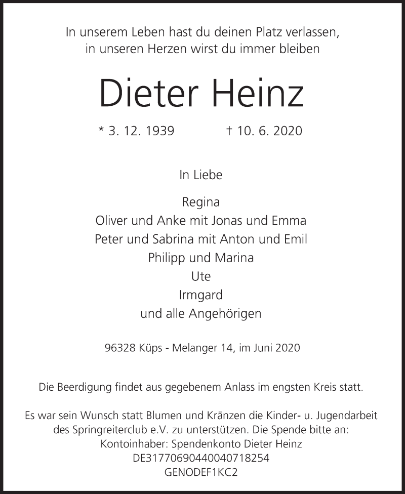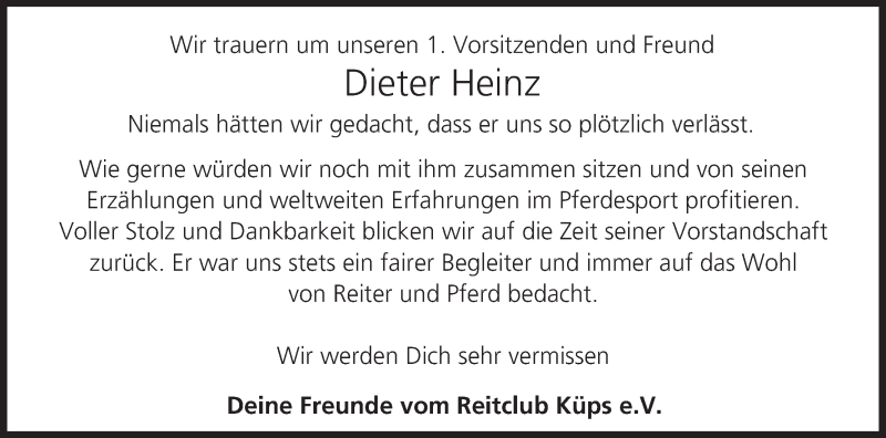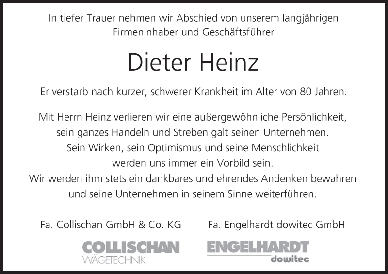 Hier finden Sie alle Traueranzeigen aus der Zeitung, die bisher für Dieter Heinz erschienen sind. Weitere Traueranzeigen, die in der Zeitung erscheinen, werden hier ebenfalls aufgelistet