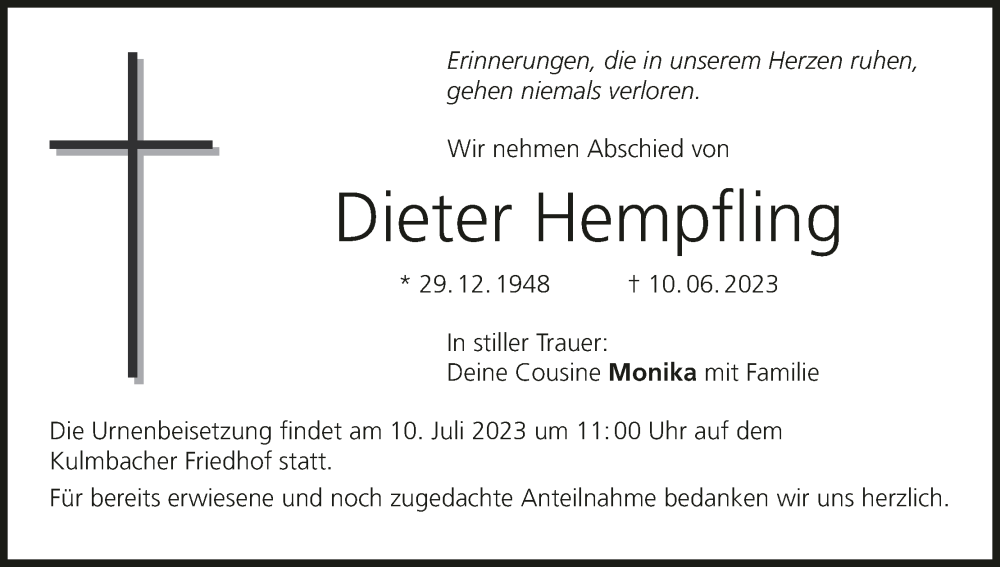 Hier finden Sie alle Traueranzeigen aus der Zeitung, die bisher für Dieter Hempfling erschienen sind. Weitere Traueranzeigen, die in der Zeitung erscheinen, werden hier ebenfalls aufgelistet