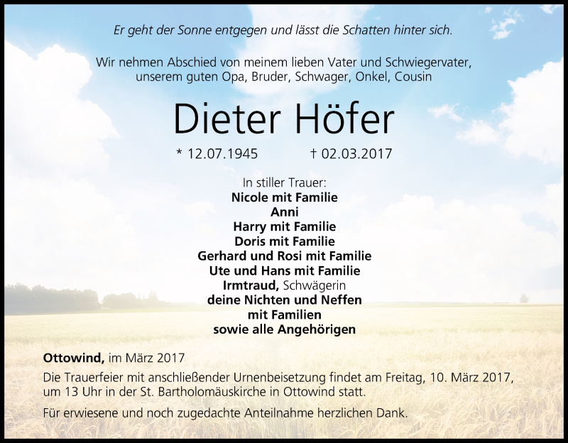 Hier finden Sie alle Traueranzeigen aus der Zeitung, die bisher für Dieter Höfer erschienen sind. Weitere Traueranzeigen, die in der Zeitung erscheinen, werden hier ebenfalls aufgelistet