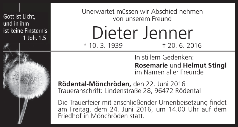 Hier finden Sie alle Traueranzeigen aus der Zeitung, die bisher für Dieter Jenner erschienen sind. Weitere Traueranzeigen, die in der Zeitung erscheinen, werden hier ebenfalls aufgelistet