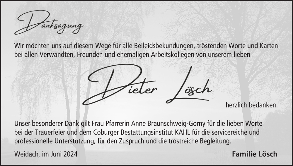 Hier finden Sie alle Traueranzeigen aus der Zeitung, die bisher für Dieter Lösch erschienen sind. Weitere Traueranzeigen, die in der Zeitung erscheinen, werden hier ebenfalls aufgelistet