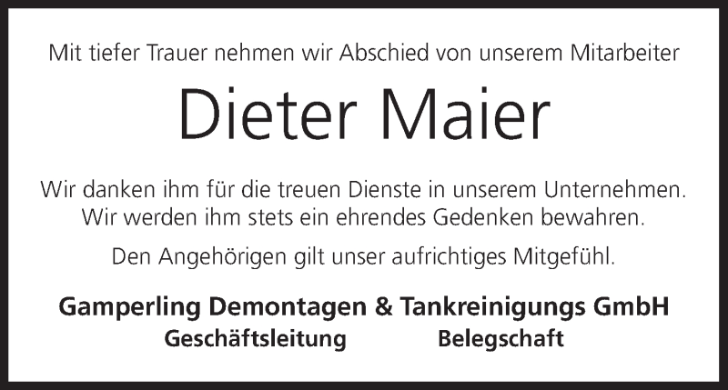 Hier finden Sie alle Traueranzeigen aus der Zeitung, die bisher für Dieter Maier erschienen sind. Weitere Traueranzeigen, die in der Zeitung erscheinen, werden hier ebenfalls aufgelistet